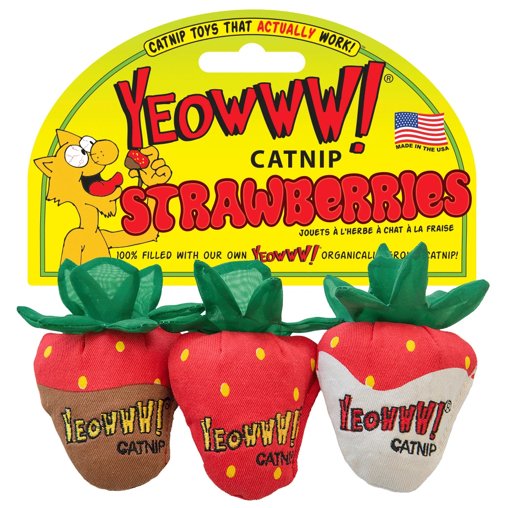 The Yeowww! Strawberry is filled with irresistible, powerful catnip. This catnip is organically grown and is the reason Yeowww! has become so well known! To further stimulate cats‘ instincts, the toys come with crackling leaves. Put the toy away after playing and give it back at another time to keep it interesting.